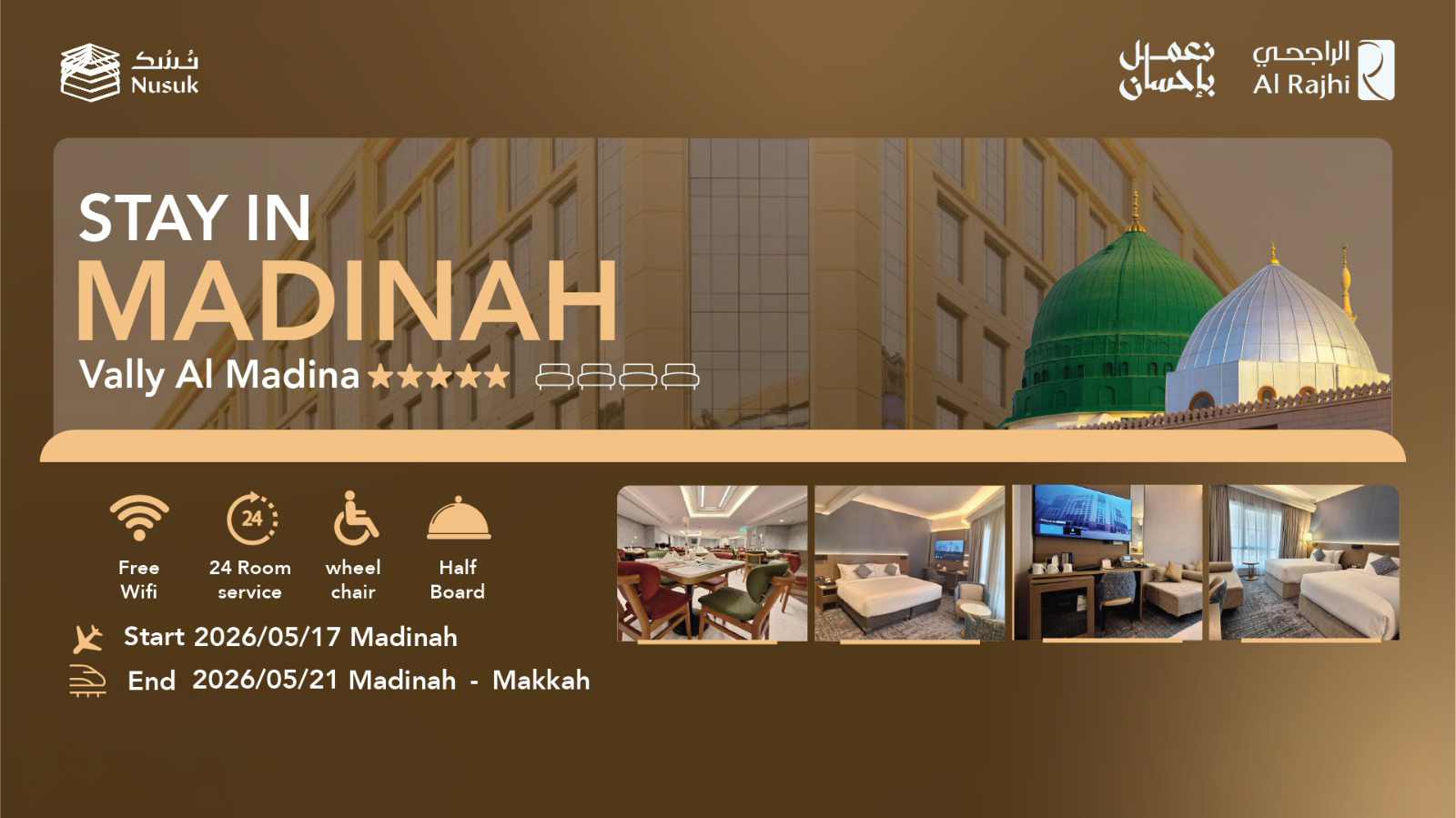 Alle Pakete werden direkt über die Plattform Nusuk Hajj gebucht. Guide Nour-Eddine bei Al Rajhi begleitet dich dabei.